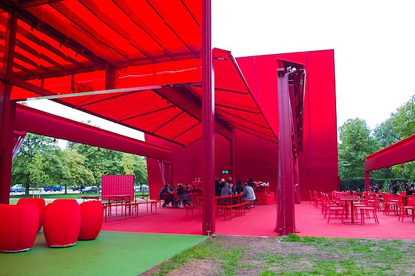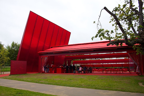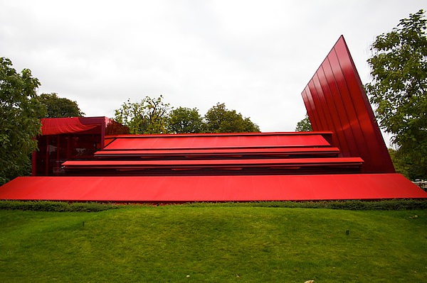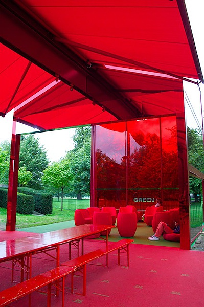 海德公園裡的Serpentine Gallery每年皆邀請一位著名建築師在展館旁的綠地建造造型獨具的休憩亭。今年是這項活動進行以來的第十週年。Serpentine Gallery邀請法國建築師Jean Nouvel主導今年的設計。Jean Nouvel以英國的傳統大紅色電話亭、郵筒和巴士為發想主軸,運用材質性格反差極大的透視型輕建材和鋼鐵架構,建起了一座造型獨特的鮮紅的涼亭,與海德公園的整片綠地形成強烈的對比。涼亭由三層斜頂構成,加上紅色的玻璃帷幕牆及布幔,雖然色彩鮮麗,但無論裡外都十分通風。