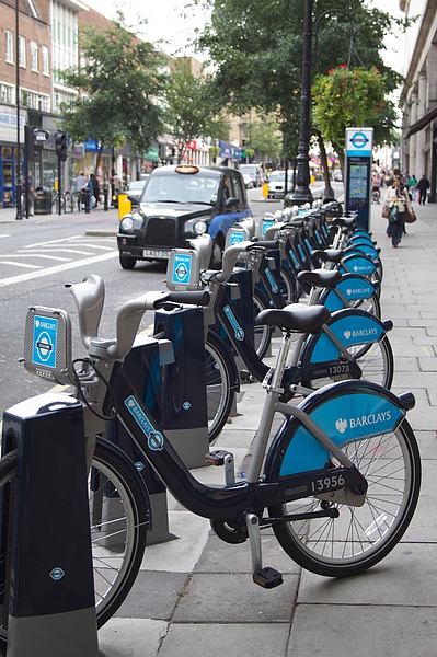 近日起,倫敦也跟上了全世界許多大城市的腳步,全市各處設立了許多大眾自行車租借點。只要使用搭乘公共交通運輸工具的Oyster卡,便可以刷卡從各點付費取得自行車,任何一個據點都可借還。騎乘時間如在三十分鐘之內,就在下個據點還車,還可以免費使用。別小看自行車的威力,在倫敦地鐵罷工的時刻,自行車的移動速度絕對超越公共汽車。因此雖然這項服務才剛推出,各個自行車租借站經常是搶借一空的狀態。要租到自行車可沒那麼容易呢!