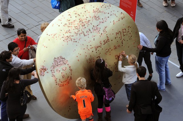 有趣的是,這件作品可以吸住一便士及兩便士的真錢,錢幣甚至可以站立在座品表面,因此過往民眾,可以隨性將口袋裡的零錢掏出,在這枚大銅板的表面恣意嘻玩,甚至可以用銅板排列出不同的圖案。整件作品表面可以吸住超過十萬枚銅板。