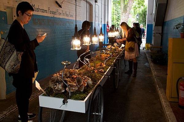 聯盟邀請設計師Faye,利用兩棟建築物間屋頂自然採光的弄堂,規劃了Super Natural特展。配合這個高級區域崇尚樂活自然的風氣,Faye邀請了野菇達人Mrs. T大嬸,提供當天從森林採摘的各類英國特有食用野菇,用精緻花藝佈置了一條野菇走廊,邀請參觀者用放大鏡細細欣賞這些大自然最美的設計。