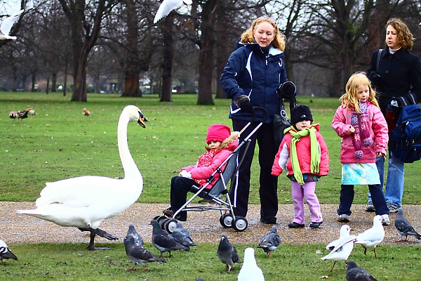 倫敦擁有許多廣大的公園綠地,在城市中轉個彎就可以進入大片的綠地,享受自然美景。肯辛頓花園湖中的天鵝和水鳥,彷彿已經習慣了與人們同在的生活,除了愜意在湖面悠游飛翔,對於來往散步,運動,休閒的人們,一點也不怕生。偶爾人們帶著麵包來到公園,只見天鵝伸長了脖子,成群結隊大大方方的從倫敦客手中啄食,甚至會追著人要食物,吃飽了就在一旁整理羽毛。有時更是追著娃娃車跑,彷彿有話要說。動物與人愉快的相處,讓倫敦客在忙碌的通勤生活,經常出狀況的地鐵,對天氣的抱怨和超高的經濟壓力中,得以維持平衡的身心狀態。快活的天鵝們可是很有貢獻的呢!