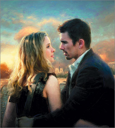 記不清第一次看Before Sunrise 是什麼時候了。只記得當時的我跟戲裡的Celine差不多大,也是屬於衝動起來就會跟陌生男人逛大街的那種搞浪漫的年紀,當然我也夢想著有Julie Delpy的美貌和智慧。另一方面當時的我又迷死了Ethan Hawke,總覺得他就是我心目中完美的男人典型。所以這部片子就成了我心目中的大經典,跟二十出頭初長成的小女人記憶無可救藥的連在一起了。
