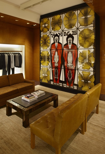 而氣氛如私人會所的地下室男裝區,則收藏了與LV默契十足的英國老牌藝術家Gilbert & George的作品《PAWS》。兩位藝術家運用自己穿著西裝的圖像為主題所做的燈箱創作,在注重男裝傳統的倫敦旗艦店,獨具呼應的意味。
