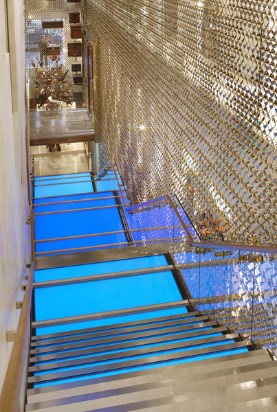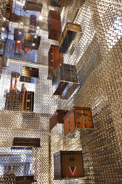 為了象徵歷史感與現代LV精神的連結,Peter Marino特別採用外牆與內裝分離的設計。走過連結古老外牆與店內的小橋,進入了豪華的「收藏家居庭」,舒適的家居氛圍,陳列多項永久收藏的藝術創作,彷彿走入英倫收藏家的私人豪邸。首先映入眼簾的是鑲嵌著LED屏幕,不斷播放電影及藝術動畫的玻璃階梯。回頭一看又被自二樓流瀉至地下室的金色LV圖騰金屬流蘇牆給震懾住。Peter Marino表示這面穿插佈置著LV經典皮箱的十米高trunk wall,意念來自舊式火車站失物認領處行李箱重重疊疊的景象。