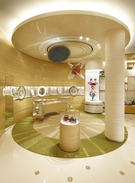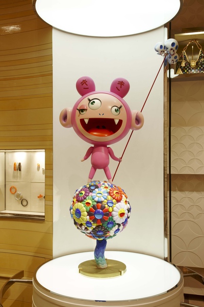 走進地面層的珠寶及腕錶展示區,Richard Prince作品《UNTITLED 5.360》如銀河系縮影般懸掛,轉動的粉紅色星球環繞著時計區不斷運行,提醒著人們永恆運轉的時間。一旁村上隆的雕塑作品《KIKI》。腳踩著色彩斑斕花瓣星球的Kiki,為陳列空間帶來一絲輕鬆莞爾的幽默感。