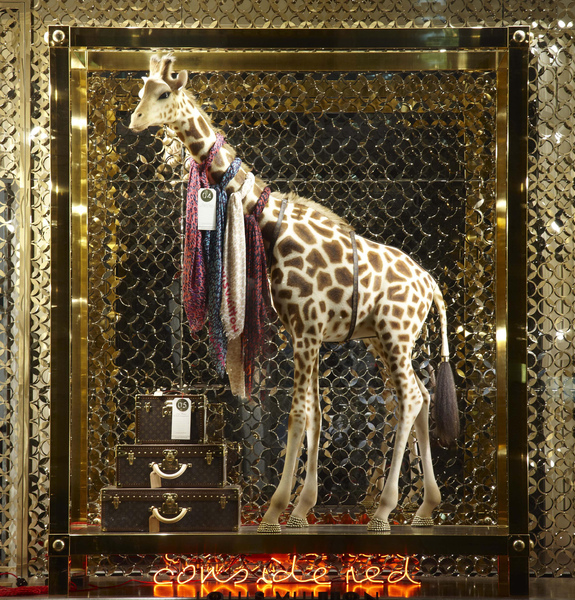 Street轉角,佔地三層的全新Louis Vuitton旗艦店, 映入眼簾的是散發著英倫氣息、氣勢磅礡的古典石灰外牆。七座巨幅玻璃櫥窗鑲嵌其中,彷彿宮廷八寶盒般,或盛裝著不斷走動的LV仕女高跟鞋、或展示鐘型玻璃膠囊內LV歷年經典小皮件構成的兔子、松鼠、公雞、蛇等小型雕塑裝置、近兩層樓高的長頸鹿脖子上也優雅的披上LV各色絲巾。建築師Peter